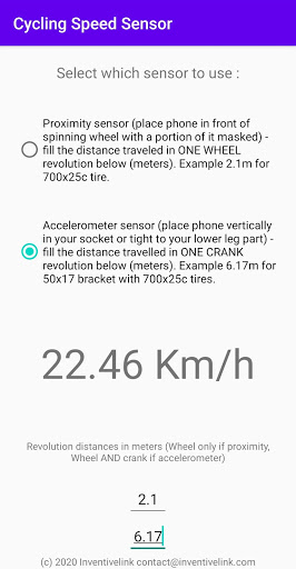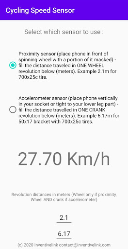 - Korzystanie z czujnika akcelerometru Android: Umieść je poziomo na udzie lub pionowo w gnieździe lub mocno do dolnej części nogi. Aplikacja automatycznie wykrywa orientację. I dostosować odległość, którą podróżujesz podczas rundy korb (domyślnie ustawiony na rower wyścigowy, opon 700x25x opon 50x17 Wspornik