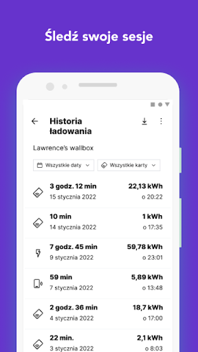 Wyświetlaj wykresy i dane ze swojej historii ładowania. Pobieraj faktury lub rekordy dotyczące wszystkich swoich sesji ładowania.
