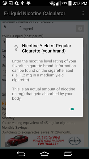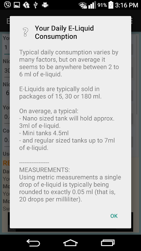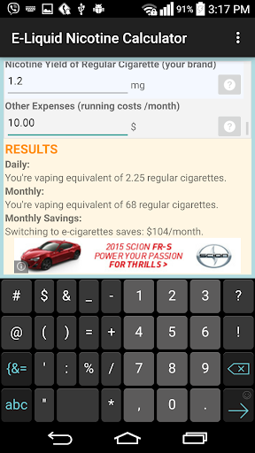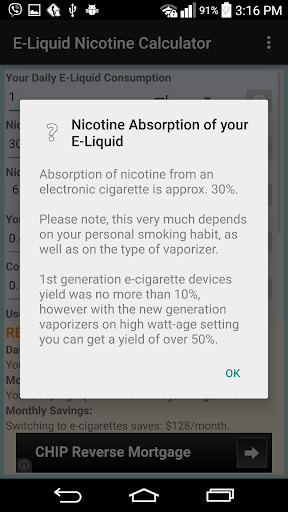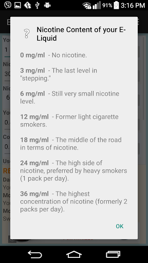 E-Liquid Nicotine Calculator allows you to calculate equivalent of how many analog 'regular' cigarettes (in terms of nicotine) you're inhaling when vaping on e-juice. Application also estimates monthly savings of switching from regular analog cigarettes to vaping.