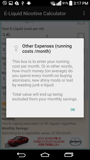 This box is to enter your running cost per month. Or in other words, how much money (on average) do you spend every month on buying atomizers, new shiny mods or lost by wasting junk e-liquid.