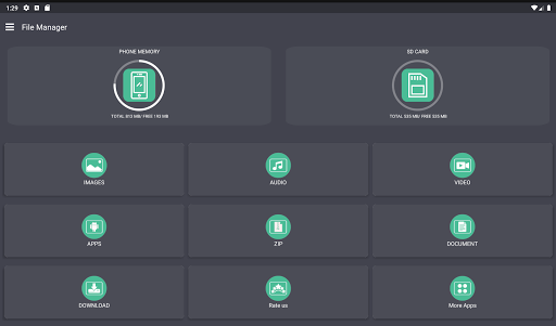 Browse files by category from the home screen: zip files, pictures, music, videos, documents and recent downloads.
