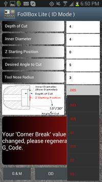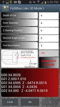 The solution to this problem is FoolBox. This small but powerful app not only gives you finger gliding satisfaction RIGHT OUT OF THE MACHINE; it also automatically calculates any chamfer angle (OD/ID) and displays the corresponding G-Code. Now in English Please. You may have a print from a customer that calls a 17 degree chamfer on an OD and a 32 degree bore chamfer - no burrs allowed! FoolBox gets the job done in seconds. Mix and match any combination of angles you desired and get the same baby bottom finish over and over again. Take FoolBox on the go with your Android mobile device and produce perfection anytime, anywhere.