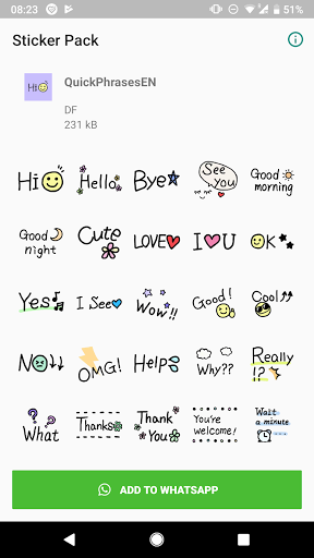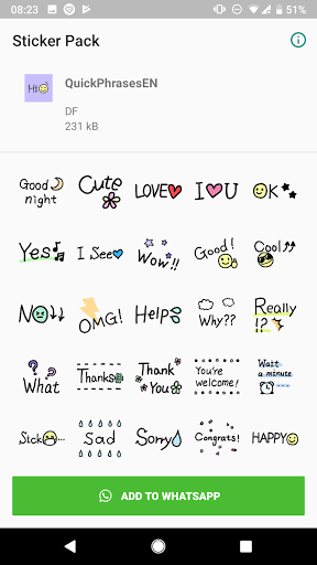 Wyślij naklejki do dowolnego czatu WhatsApp. Po pobraniu English Text Stickers WhatsApp - Wasterker Pack, można podzielić się nim ze znajomymi. Proste romantyczne naklejki mogą pomóc Ci wysłać miłość do ukochanej osoby. Róże i inne urocze kwiaty zachwycą odbiorców. Jasne emoji sprawi, że przyjazny czat był bardziej interesujący, a emotikony sprawią, że twoi przyjaciele się uśmiechną. Naklejki pomogą Ci wyrazić te emocje, które są trudne do przekazywania słowami. Ponadto będziemy dodawać nowe naklejki i gify. Będziemy również dywersyfikować funkcjonalność aplikacji w przyszłości. Masz teraz okazję skorzystać z tych świadczeń.