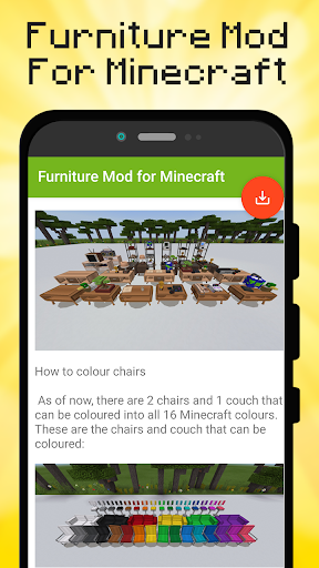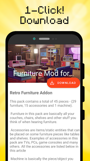 Mod meble dla Minecraft PE jest aplikacją, która zawiera Addon MCPE o nazwie "Meble retro". Ten dodatek dodaje nowy 29 mebli, 15 akcesoriów i 1 maszyny do świata Minecraft Pocket Edition.
