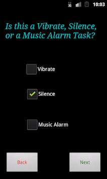A simple app that allows the user to input events given a certain time frame. These events can do one of three things. The first is to turn your phone to vibrate when the task starts and then back to normal when the task ends. The second is to do the same thing, but turn your phone silent. The last is to create an event that plays music at the provided start time(like an alarm). The song can be chosen by typing in the name of a song that is currently on your phone. Events can be set to future dates and can repeat.