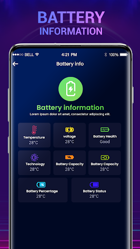 - Podczas ładowania mobilnego, na wypadek, gdyby telefon zostanie odłączony od ładowarki, funkcja alarmu akumulatorów zacznie się automatycznie. Pojemność baterii, rodzaj ładowania i procent baterii.