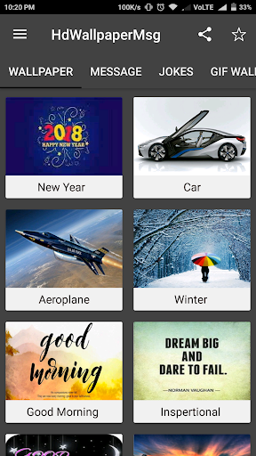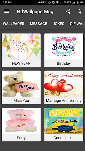 Get the Best wallpaper, Text message, jokes and Gif Wallpaper all in this app. In this app you will get best wallpaper for Samsung, Sony, LG, Lenovo, HTC, ASUS, Alcatel, Huawei, Meizu, Xiaomi and others, based on festivals, Occasion and other wallpapers like Inspiration, good morning, good night, Animals, Space, Nature etc.
