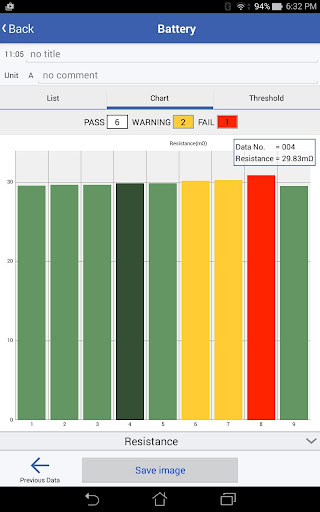 - bateria: Ta funkcja służy do nagrywania danych pomiarowych przesyłanych z testerów baterii. Nagrane dane mogą być wyświetlane na wykresie lub formularzu listy. Numer baterii można potwierdzić słyszalnie przez funkcję przewodnika do rejestracji pomiarowej.