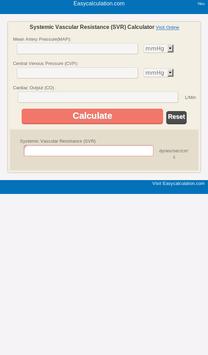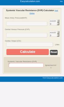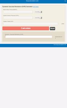Online Health Calculator which calculates the Systemic vascular resistance from the given values of cardiac output, Central venous pressure and Mean artery pressure.