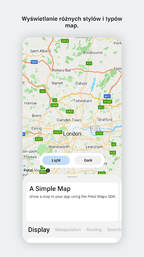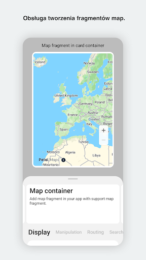 Petal Maps Platform zapewnia funkcje map działające na różnych platformach i urządzeniach. Obecnie obsługiwany jest system Android, a w niedalekiej przyszłości obsługiwany będzie system iOS. Petal Maps Platform jest dostępna w ponad 200 krajach i regionach z całego świata. Obsługuje ponad 70 języków. To globalna, otwarta platforma map obejmująca ponad 190 mln interesujących miejsc oraz ponad 80 mln dróg z całego świata. Podstawowe funkcje obejmują wyświetlanie map, wyszukiwanie miejsc, ustalanie lokalizacji i planowanie trasy. Wyświetlanie map obejmuje możliwość dostosowania stylu mapy, zapewniając ponad 100 przeznaczonych do tego elementów. Wyszukiwanie miejsc obejmuje wyszukiwanie strefy czasowej, wyszukiwanie pobliskich miejsc, geokodowanie i wyszukiwanie według słów kluczowych. Ustalanie lokalizacji obejmuje zespolone dane lokalizacyjne, system lokalizacji satelitarnej Super GNSS, geofencing o niskim poborze energii, ustalanie lokalizacji na poziomie pasa ruchu do celów nawigacji w pojazdach oraz precyzyjną lokalizację w pomieszczeniach. Planowanie trasy obejmuje zapytania o trasę i natężenie ruchu drogowego, obliczanie przewidywanego czasu przybycia oraz nawigację. Petal Maps Platform zapewnia również globalne usługi posprzedażne. Niniejsza demonstracja została opracowana na podstawie otwartych funkcji Petal Maps Platform, umożliwiając twórcom zapoznanie się z zaawansowanymi możliwościami tej platformy.