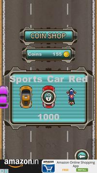 Drive the car along the road and avoid the cars and trucks coming the opposite way. Collect coin and the money bags to buy new cars and bikes.