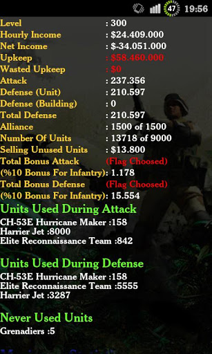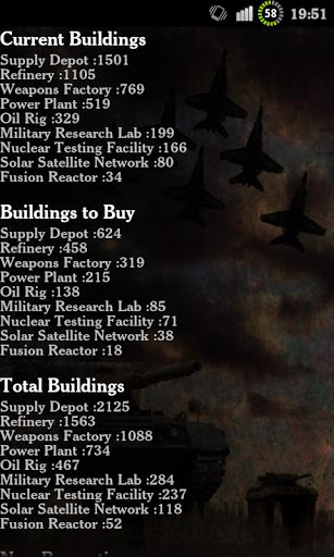 This application is a guide and calculator for your Storm8 World War Live game. This program has no connection to internet (except ads!) or your game, just an offline calculator that optimize your World War account. Completely free app! You can easily make calculations for optimum income, attack and defense points about buildings or units. There is no limit, can use many accounts and easily manage them.