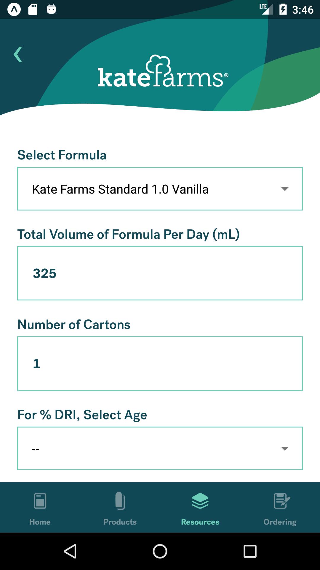 Formula calculator that shows nutrition provided for exact volumes, with % DRI for pediatrics