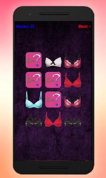 This a pure adult game. You can have fun as well as improve your memory. You have to match same 2 Bra in the given grid of 4*3 ( Easy Level ), 5*4 (Medium Level ), 6*5 ( Hard Level ) in limited moves. Each categories have 6 different levels and as you move to upper level, the number of moves keep decreasing. As you keep clearing the level you get harder levels.