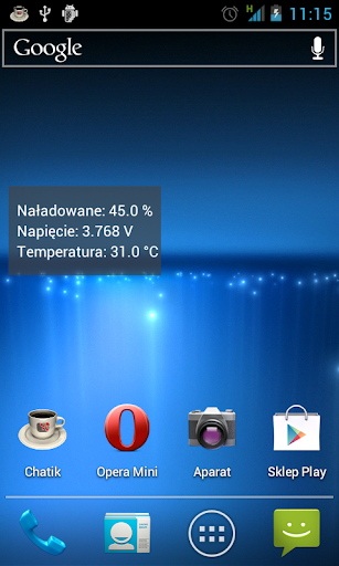 Prosty Widget Baterii z tekstowymi informacjami o poziomie naładowania, napięciu i temperaturze.