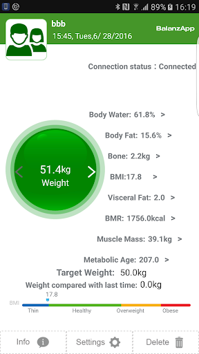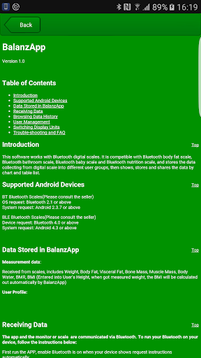 Ta aplikacja umożliwia łatwe monitorowanie niezbędnych danych zdrowia i fitness dla: masy ciała, częstotliwości tkanki tłuszczowej, wody korpusowej, masy kostnej, masy mięśniowej, BMI, BMR i Tłuszcz Vokeryczny. Z wyświetlaczy graficznej można sprawdzić zmiany w trendach zdrowotnych Pozostań na dobrej drodze dla zdrowszego stylu życia. Skala jest nieoceniona. Z podnoszeniem palca, wszystkie dane zostaną automatycznie nagrane i są dostępne w aplikacji. Możesz także udostępniać swoje dane do platform, takich jak Facebook, Twiiter, Sina Weibo, e-mail i wiadomość. Waży siebie, skala Balanzapp pomaga wszystkim naszym użytkownikom pozostać na dobrej drodze dla zdrowszego stylu życia. Skala zrobi resztę!