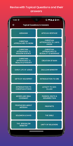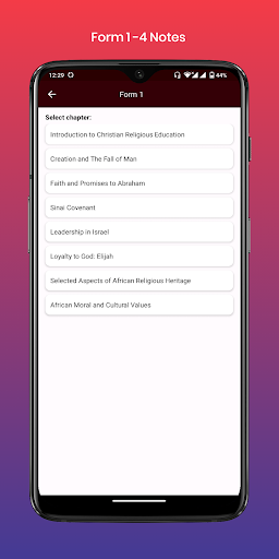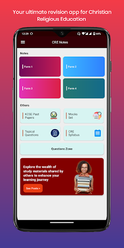 iii) przyjazny dla użytkownikaInterfejs: Bez wysiłku przejdź przez przyjazny dla użytkownika projekt.Dążąc do najlepszych wyników KCSE lub po prostu dążąc do zwiększenia wiedzy CRE, aplikacja CRE Form 1-4 Notes jest Twoim ostatecznym towarzyszem.Pobierz teraz i wyrusz w podróż w kierunku CRE Excellence!