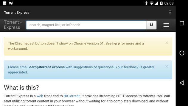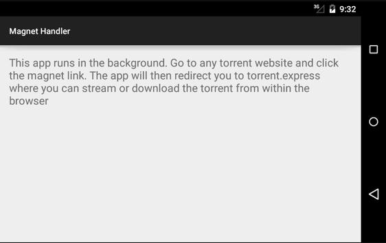 search any torrent, click the link, then hit the android button to start streaming. Also handles magnet links from torrent sites such as piratebay or kickass torrents. Press any magnet link to be presented with a stream.