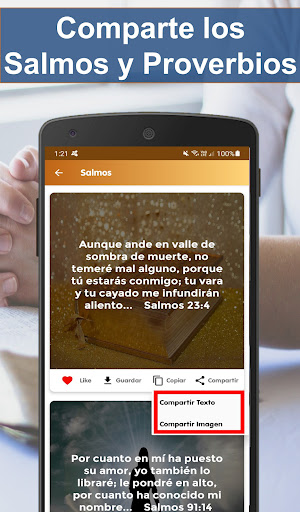 Możesz także udostępniać, wysyłając przez WhatsApp lub Facebook, na przykład, każdy z rozdziałów psalmów i przysłów Biblia z przyjaciółmi i rodziną; Możesz nawet udostępniać każdy z obrazów, które znajdziesz w naszej aplikacji Psalm i Przysłów, aby medytować.