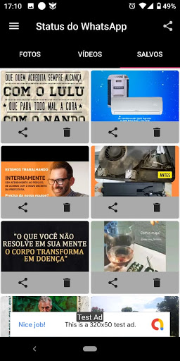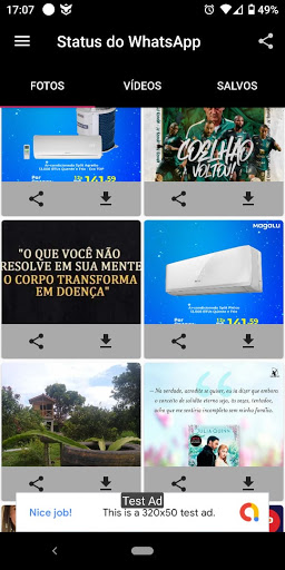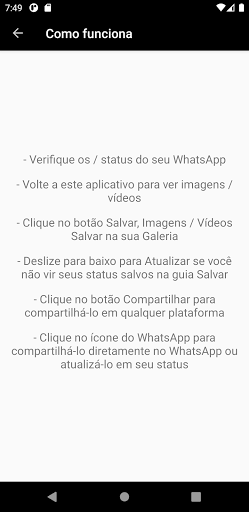 É bem fácil usar esse aplicativo, basta você abrir à qualquer momento e selecionar o status que você quer baixar e conferir na sua galeria, muito simples.
