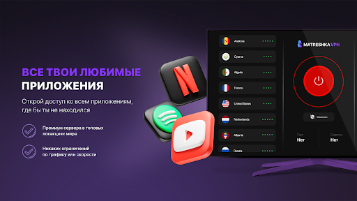 Netflix, Tiktok, Instagram - Odwiedź swoje ulubione strony jak poprzednio.VPN Matreshka jest niezawodnym sposobem ochrony przed cenzurą internetową, ograniczeniami, zagrożeniami phishingowymi i czarnymi reklamami.Zapewnia bezpieczeństwo we wszystkich sieciach, w tym w punktach publicznych Wi-Fi (hotspot Wi-Fi).
