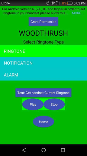 If you like to set the sound of bird as ringtone on your handset tap on "Ringtone"button. On the next screen if you are using android version higher than 6 then tap on "Grant Permission" button and enable "can modify or change system settings" option for this app.