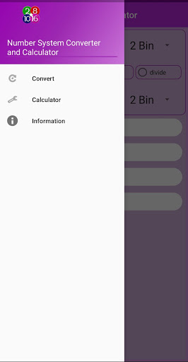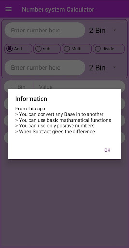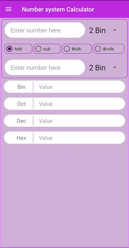 • Using this app (Number system(Base) converter and calculator) you can do the base conversion and perform basic math operation of positive numbers.