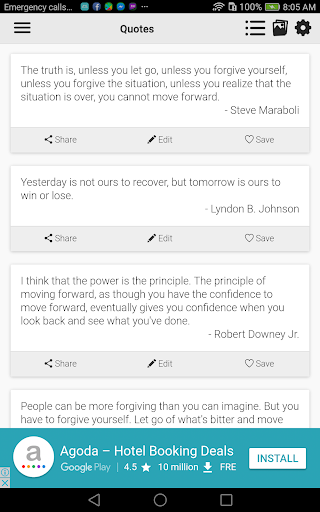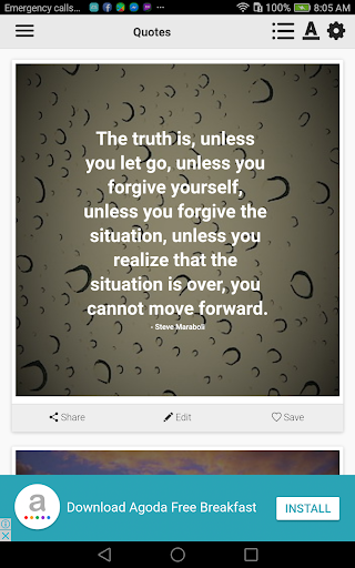 Jest wiele wspaniałych funkcji w tej aplikacji. Pozwól, że je podsumowuję Widok listy (które można zobaczyć wiele cytatów na jednym ekranie) i pojedynczy widok cytatu (który pokaże tylko 1 cytat, ale będzie miał większą czcionkę i wyraźniejszą przestrzeń). Pozostawiamy to, aby wybrać ten, który najbardziej lubisz! .