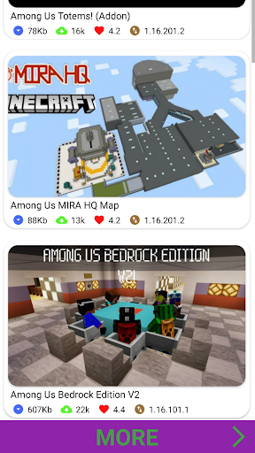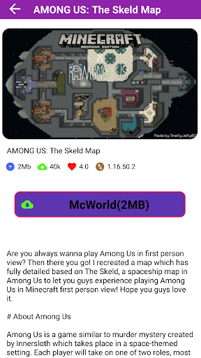 Ten wśród nas MOD dla Minecraft PE Skins & Map Aplikacja umożliwia automatyczne zainstalowanie modu za pomocą jednego kliknięcia bez problemu. I możesz dodać wszystkie dodatki, mapy, skórki i mody spośród nas, które chcesz do gry MC PE.