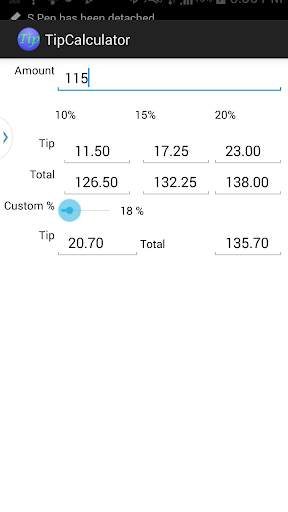 This app allows the user to calculate instantly the percentage of tip (could be 10%, 15%, or 20%) after entering an initial amount. Also, the user has the ability to get a different percentage of his/her choice.