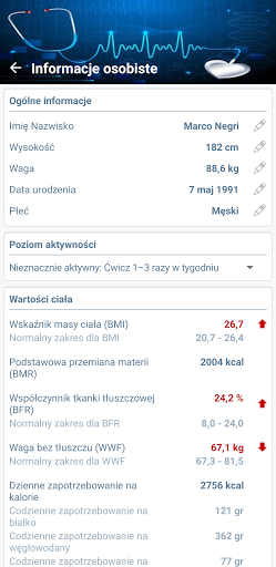 - Śledzenie wagi i powiązanych parametrów, takich jak wskaźnik tkanki tłuszczowej, wskaźnik masy ciała, dzienne zapotrzebowanie na kalorie, dzienne zapotrzebowanie na wodę i inne...