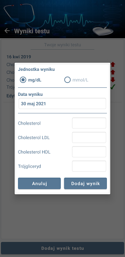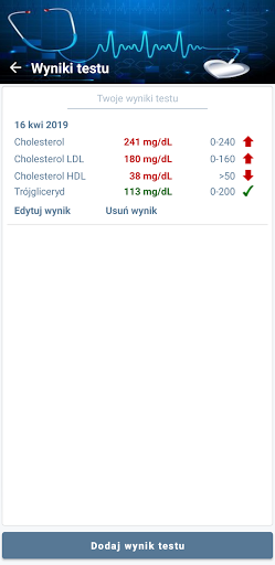 - Przechowywanie, edytowanie i usuwanie wyników testu Panelu Lipidowego (cholesterol, trójglicerydy, cholesterol LDL i HDL)