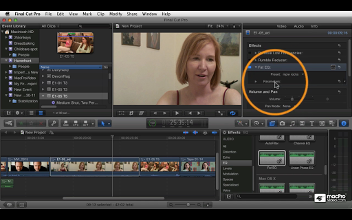 z poziomów audio rozpuszcza płynnie w sekcję na przejściach, gdzie dowiesz się wszystkiego o dźwięku Cross-Fnies w pierwotnej fabuły i krzyżowych kompleksowych połączonych klipach. Następnie Maestro Wohl znajduje się na stereo i panoramowanie otoczenia, i wyjaśnia niesamowitą nową logikę Pro eq i przestrzeni wtyczki, które są dołączone z Final Cut Pro X.