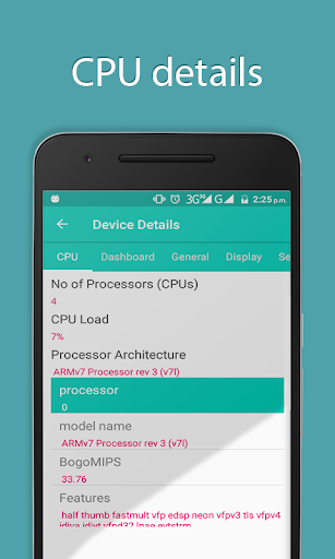 "Phone details: CPU info" is a phone tester which tests you your device hardware, sensor, Wifi info,