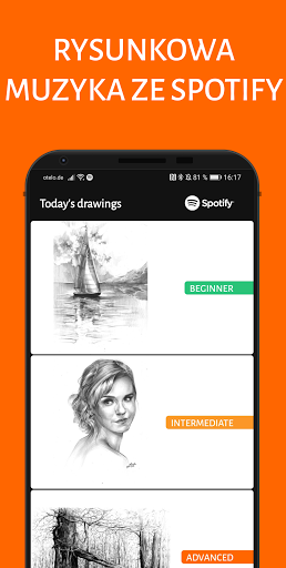 DrawBy ma wbudowane listy z muzyką Spotify. Słuchaj pozytywnej i relaksującej muzyki i jeszcze bardziej ciesz się ćwiczeniem.