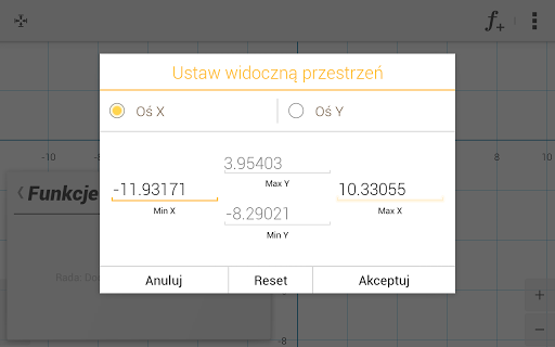 •• poruszanie/przybliżanie widzialnego obszaru układu współrzędnych przy pomocy gestów przesuwania/uszczypnięcia