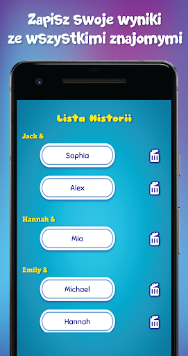 Po prostu wpisz swoje imię i nazwisko znajomego, a następnie wypełnij różne quizy dotyczące Twojej przyjaźni z tą osobą. Po ukończeniu 10 pytań w każdym quizie nasz unikalny algorytm oceni twoje odpowiedzi i poda procent siły tej przyjaźni. Następnie możesz zapisać swoje wyniki z każdym przyjacielem, a nawet podzielić się z nim swoim najlepszym wynikiem!