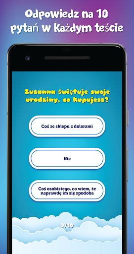 Do wypróbowania jest 5 różnych quizów przyjaźni, z których każdy zawiera 10 pytań na temat ciebie i twojego znajomego, zadając pytania takie jak: Czy ufasz swojemu przyjacielowi? Czy znają wszystkie twoje sekrety? Co byś zrobił, gdybyś usłyszał plotki o swoim przyjacielu? I wiele, wiele innych ...