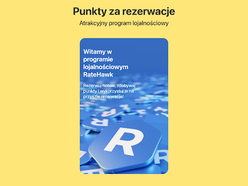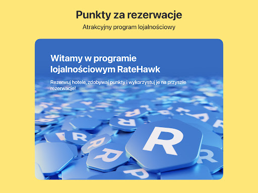To wielki atut rezerwowania na RateHawk. Rezerwuj hotele, zbieraj punkty i wykorzystaj je częściowo lub w całości, aby opłacać rezerwacje i oferować zniżki dla klientów. 1 punkt lojalnościowy = 1 jednostka waluty.