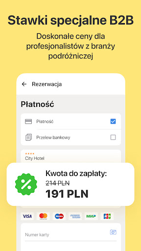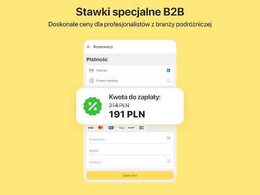 Możesz wybierać spośród 1300 000 hoteli, pensjonatów, hosteli i apartamentów w najlepszych cenach, dostępnych dla klientów biznesowych i biur podróży. Pracujemy z największymi dostawcami usług turystycznych na świecie i bezpośrednio z dziesiątkami tysięcy hoteli. Dzięki temu możemy oferować najlepsze stawki, co pozwoli Ci oszczędzać pieniądze.