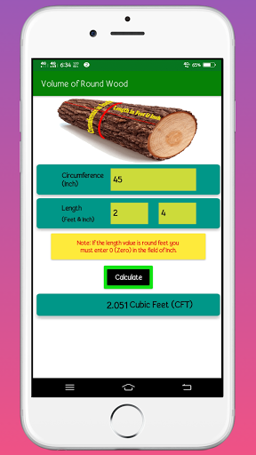 pomiaru objętości okrągłego drewna należy umieścić wartość obwodu w calach i długości w stopach i obu.Jeśli długość jest w okrągłych stóp, musisz wprowadzić 0 (zero) w polu CAL.Amortyzacja wynosi 21,50%, a drewno użyteczne wynosi 78,50%