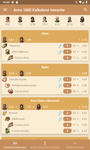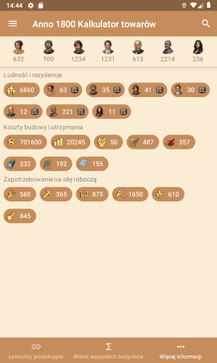 Anno 1800 Towary Kalkulator dla systemu Android oblicza liczbę niezbędnych budynków produkcyjnych dla Ciebie w oparciu o populację Twojej wyspy. Zapewnia to optymalne zaopatrzenie mieszkańców.