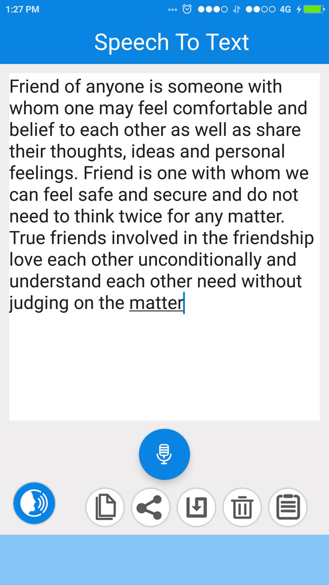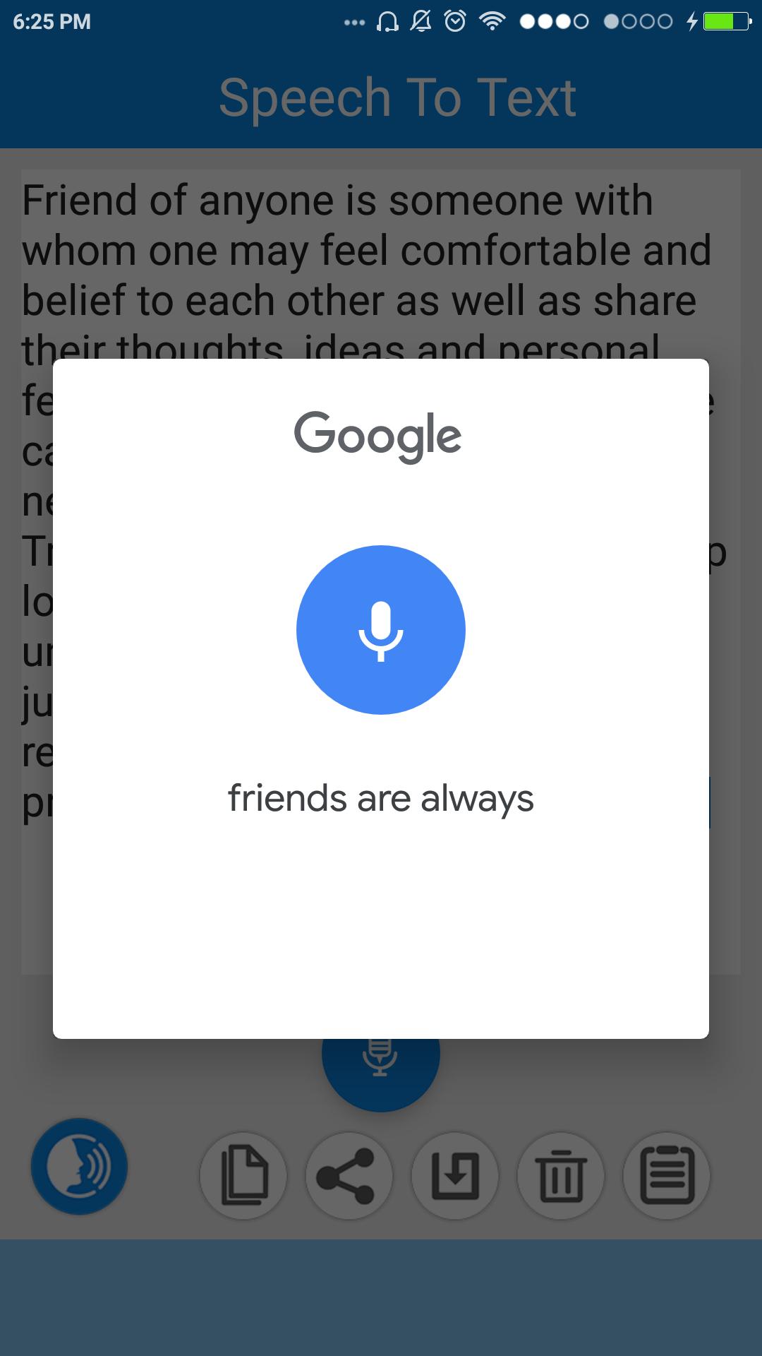 Using Speech to Text offline, you can share your text file with all the supported application on your phone. You can copy the text and send as a message/text form to your contacts. Speech To Text online app provides facility to save the text into your device and next time you just share that file with copied your contacts.