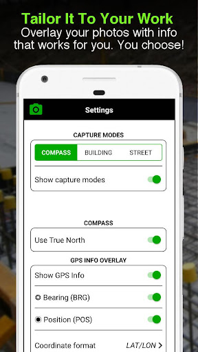 - Pokaż punkty kardynałów w trybie budowlanym; np. Elewacje północne lub południowe budynku. Dwa zdjęcia do Roll kamery jednocześnie; jeden z wytłoczonymi informacjami, a drugi jako oryginalne zdjęcie.