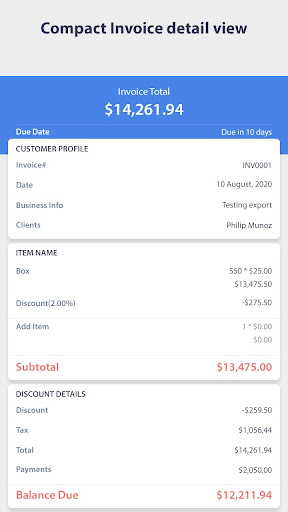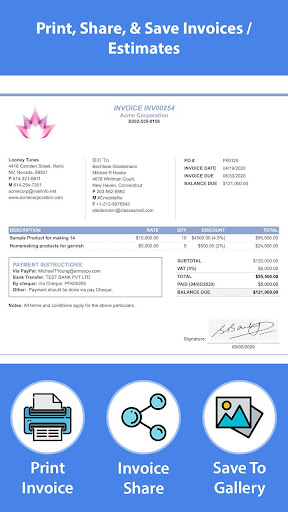Aplikacja generuje fakturę profesjonalną i łatwo oszacować. Automatycznie oblicza podatki, rabaty, całkowita kwota i płatna kwota. Możesz także podpisać swoje faktury i szacunki. Możesz także zapisać dodatkowe notatki, obrazy i szczegóły płatności w fakturze / oszacowaniu. Aplikacja umożliwia zapisanie, udostępnianie i wydrukowanie faktur i szacunków.