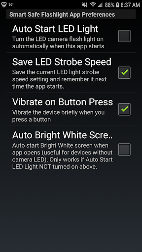 7. Ekran Preferencje Aby umożliwić użytkownikowi ustawienie osobistych preferencji / ustawień, takich jak ustawienie, czy kamera LED zostanie automatycznie włącza się automatycznie, gdy aplikacja zostanie otwarta lub wyłączanie wibracji do przycisków.