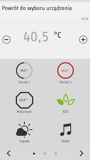 Wszystkie opcje, które można nastawić na panelu obsługowym, są dostępne także w aplikacji. Umożliwia to wygodne nastawienie temperatury i funkcji. Aplikacja umożliwia także nastawienie pamięci temperatury oraz wybór i nastawienie funkcji oszczędzania energii.