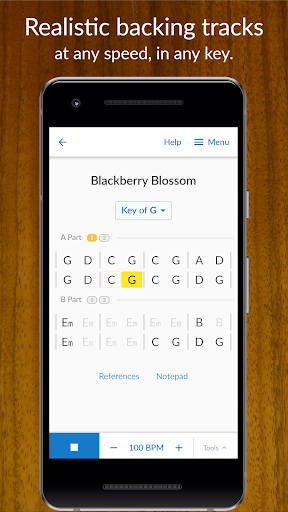 Practice all your songs with customizable backing tracks generated with audio from real instruments: guitar, mandolin, and standup bass.