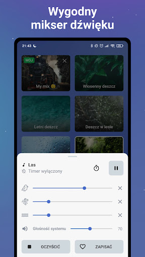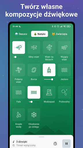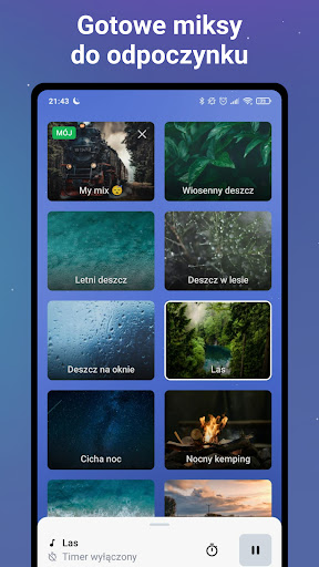 Zaskocz się, jak łatwo zasnąć z kojącymi dźwiękami do spania. Wybierz i skomponuj własne zestawy dźwięków, aby złagodzić stres lub zwiększyć koncentrację. Ustaw minutnik i nie martw się o baterię telefonu, minutnik płynnie zagłuszy dźwięki.