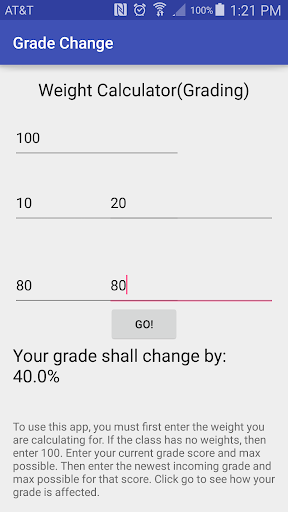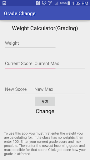 Using this app, one can calculate the percentage change their grade will undergo with an incoming score. Simply enter the weight value you are calculating for(100 if not weighted). Then, enter your current grade ratio and incoming assignment/assessment score and max possible. Click go to see the percentage change. If positive, the grade will raise. If negative, the grade will fall.